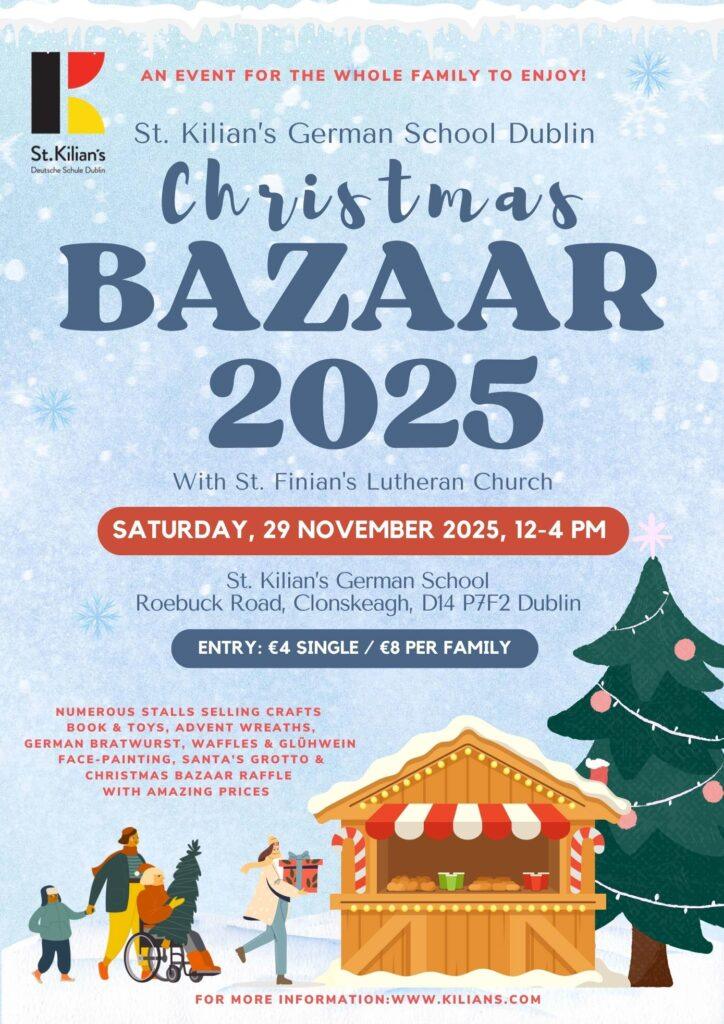 Wir freuen uns auf den diesjährigen Weihnachtsbasar am Samstag, den 29. November 2025, von 12 bis 16 Uhr in der Roebuck Road in Clonskeagh. Alle sind herzlich eingeladen, uns zu besuchen und die Vorweihnachtszeit einzuläuten!