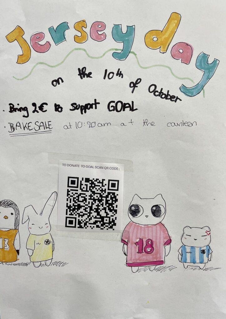 Am Freitag, dem 10. Oktober 2025, veranstalteten der Wohltätigkeitsclub der Sekundarschule und die Schülervertretung der Grundschule gemeinsam unseren jährlichen Jersey Day und einen Kuchenverkauf zugunsten von GOAL, und sammelten dabei unglaubliche 1.270 € für die Wohltätigkeitsorganisation. Der Campus war voller bunter Trikots und guter Laune, während Schüler und Mitarbeiter in den Pausen gebackene Leckereien genossen. Die Kinder im Kindergarten und der Grundschule haben im Rahmen unseres Wettbewerbs „Entwirf ein Trikot“ fantastische Zeichnungen ihrer Lieblings-Trikots angefertigt. Vielen Dank an die gesamte Schulgemeinschaft für den großen Einsatz, die Unterstützung und die Beiträge zur Förderung der weltweiten Arbeit von GOAL.