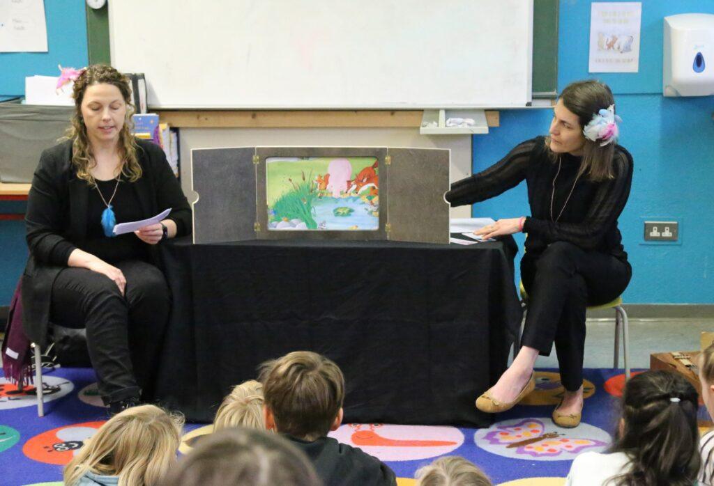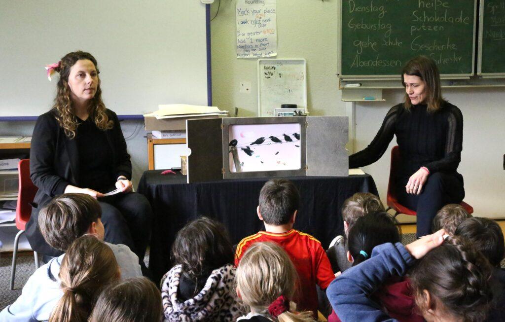 Unsere Grundschulkinder der 2. und 3. Klasse freuten sich über einen ganz besonderen Besuch von Verena und Claudia vom Goethe-Institut Irland, die ihnen eine spannende Kamishibai-Theateraufführung präsentierten, die auf dem Buch „Als die Raben noch bunt waren“ der Autorin Edith Schreiber-Wicke und der Illustratorin Carola Holland basiert.