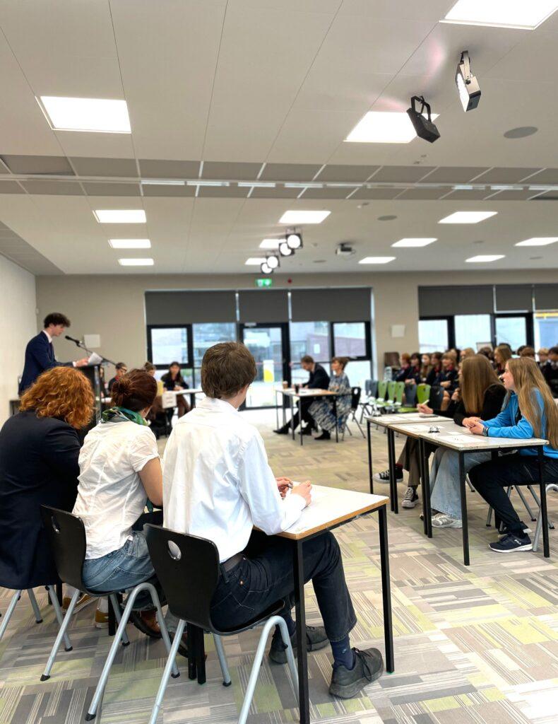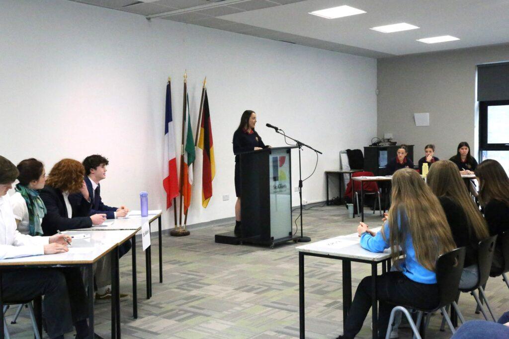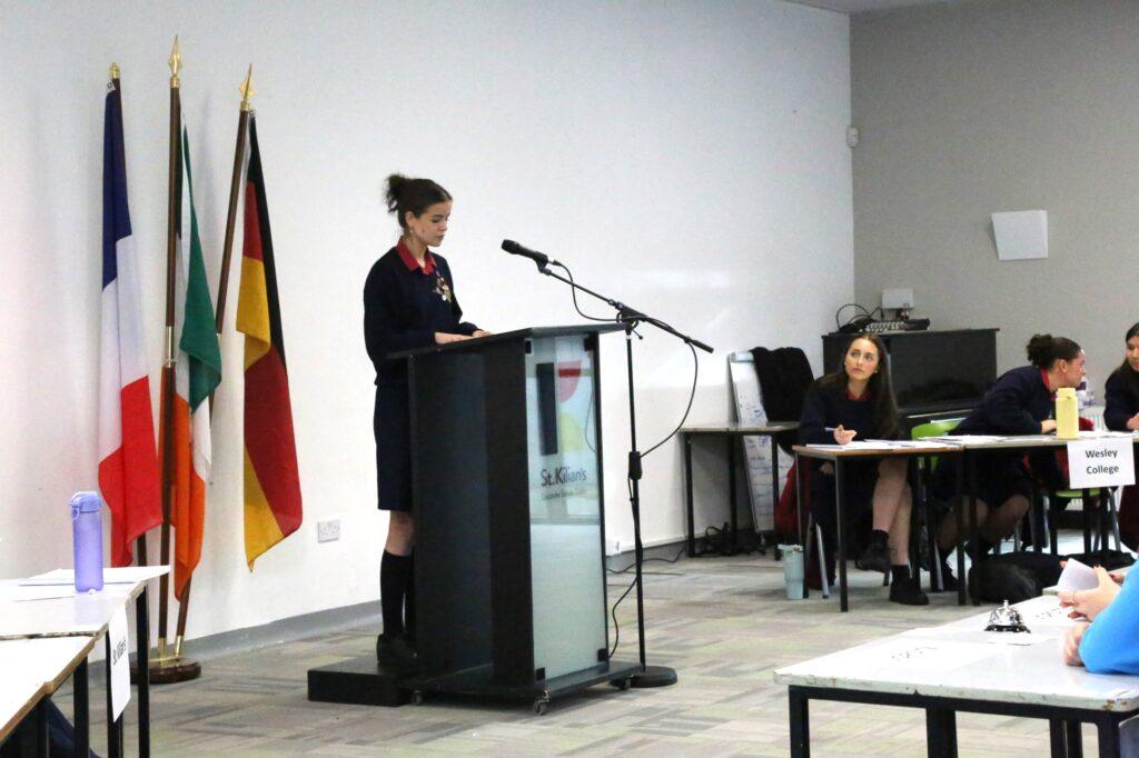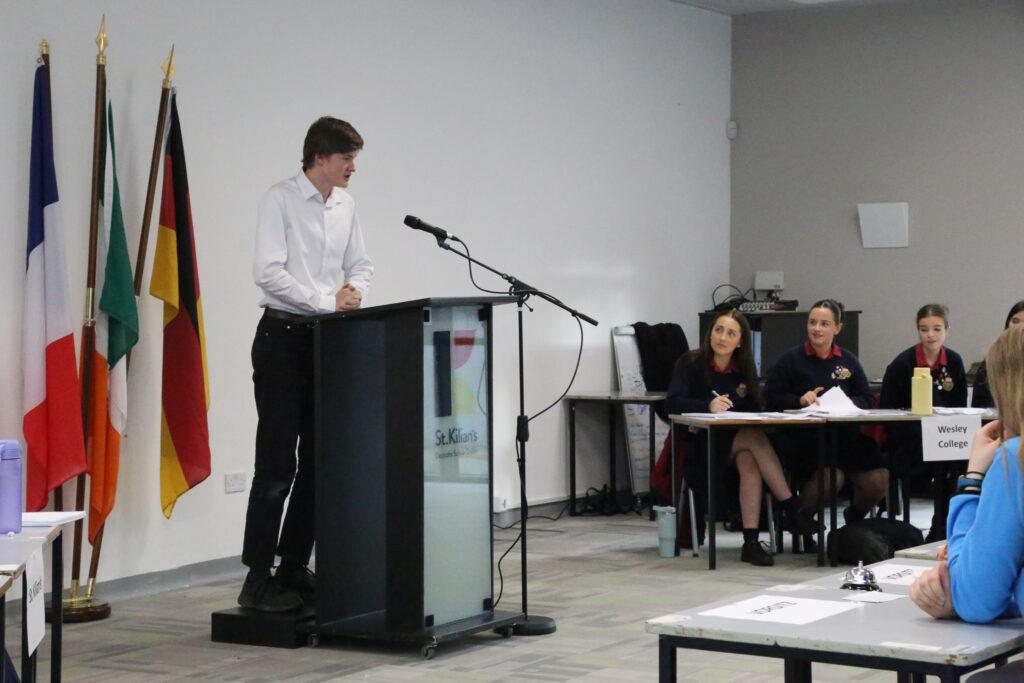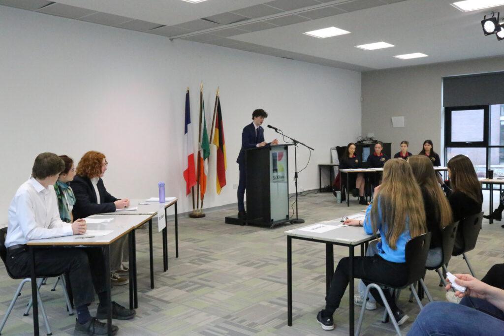Both teams delivered a thoroughly researched and highly engaging debate, presenting strong arguments and well-chosen examples. The St. Kilian’s team—captained by Michael and including Trajan, Aoife and Jacob—argued in favour of replacing boys and girls only schools in Ireland, while the Wesley College team, led by Evelyn and including Hannah, Eva and Ella, presented a compelling opposition to the motion.