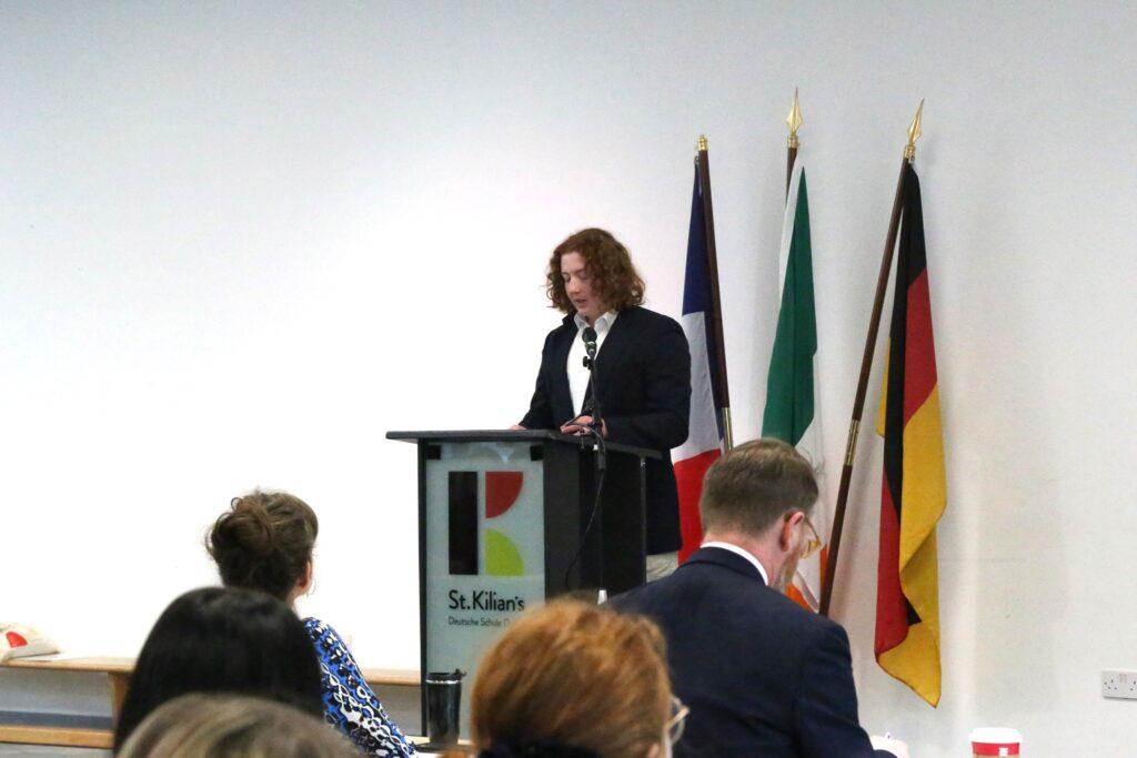 The entire debate was conducted in fluent German, showcasing the students’ outstanding linguistic abilities. After a dynamic exchange of arguments and rebuttal, adjudicators Mrs Canton (Mount Anville Secondary School) and Mr Morgan (lawyer and St. Kilian’s parent) awarded the win to St. Kilian’s by only a few points.
