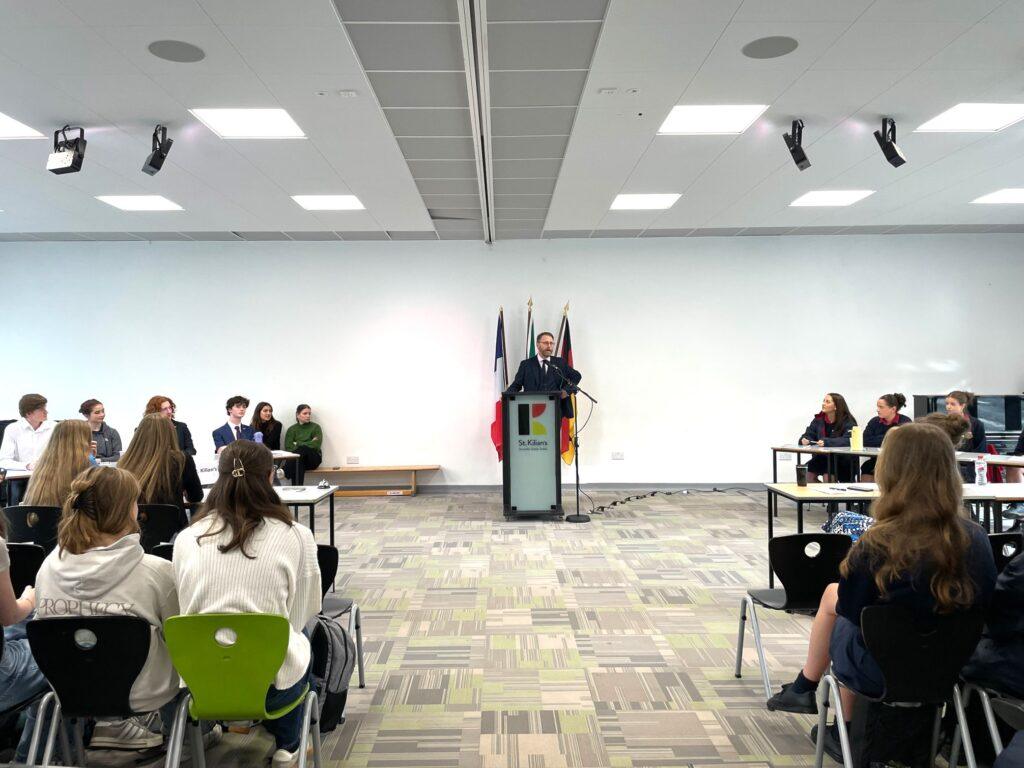 Yesterday morning, November 17th, St. Kilian’s welcomed Wesley College Dublin for an impressive debate in German language on the motion: “Schools that are exclusively for boys or girls should be replaced by co-educational schools” („Reine Mädchen- und Jungenschulen sollen abgeschafft und durch ko-edukative Schulen ersetzt werden“).