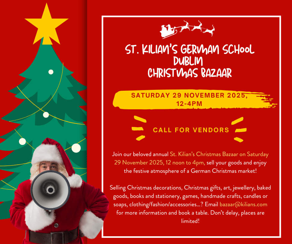 Join our beloved annual St. Kilian’s Christmas Bazaar on Saturday 29 November 2025, 12 pm noon to 4pm, sell your goods and enjoy the festive atmosphere of a German Christmas market!